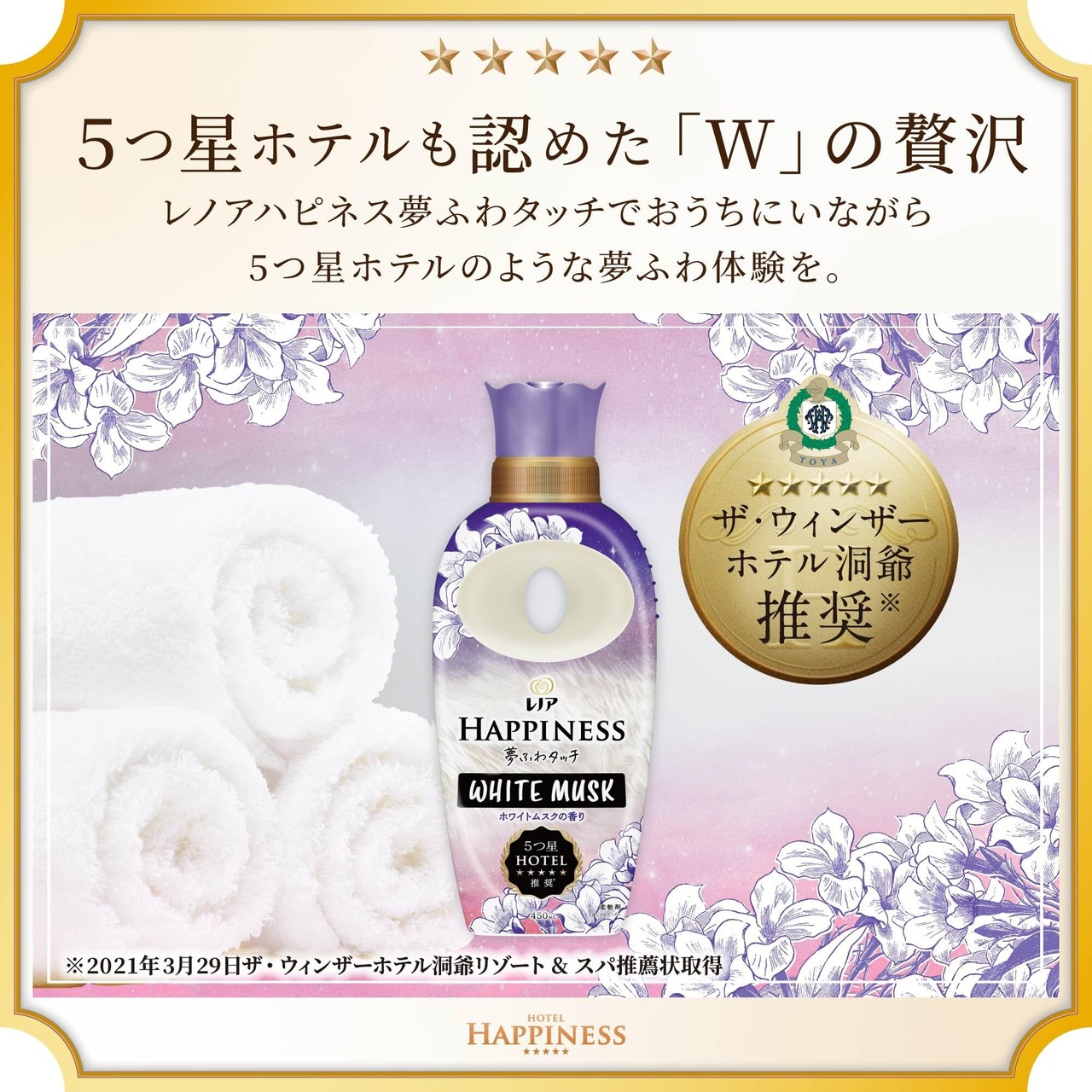 レノアハピネス夢ふわタッチなら5つ星ホテルも認める贅沢な香りが1週間*楽しめます。(*保管状態にて)あたたかく香るムスクとさわやかなホワイトフローラルに包まれて、リラックスナイトに贅沢なときめきを。