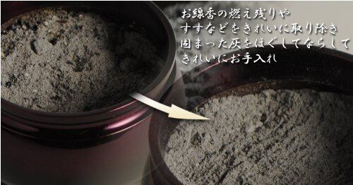 香炉灰を、灰ならしで掘り起こしておくと、灰の表面がやわらかくなり、お線香を立てやすくなります。また見た目もきれいに保てます。