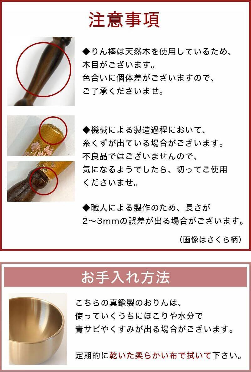 リン棒の叩く部分に金襴が使われているので、音色が長く響きます。