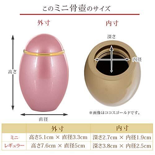ご安置しやすい掌サイズ こちらのミニ骨壺ココスは、掌に収まる大きさで、お部屋やお仏壇にご安置しやすいサイズです。いつもの空間に、そっと寄り添う様に大事な故人様の存在を感じることが出来ます。外寸:高さ5.1cm × 直径3.3cm 内寸:深さ2.7cm × 内径1.9cm