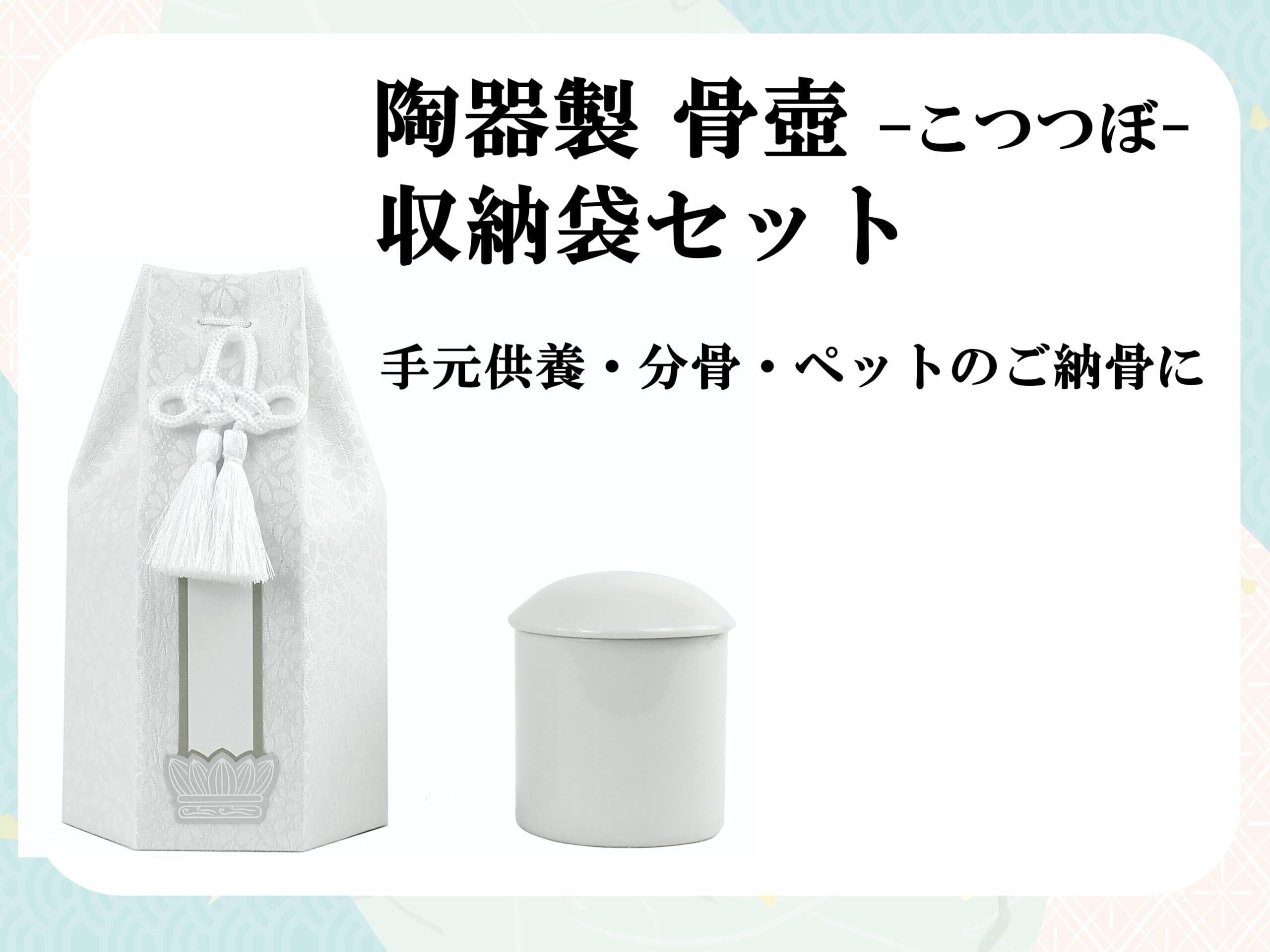 手元供養・分骨などに最適なコンパクトサイズの陶器製骨壺です。収納袋とのセットでご用意しております。