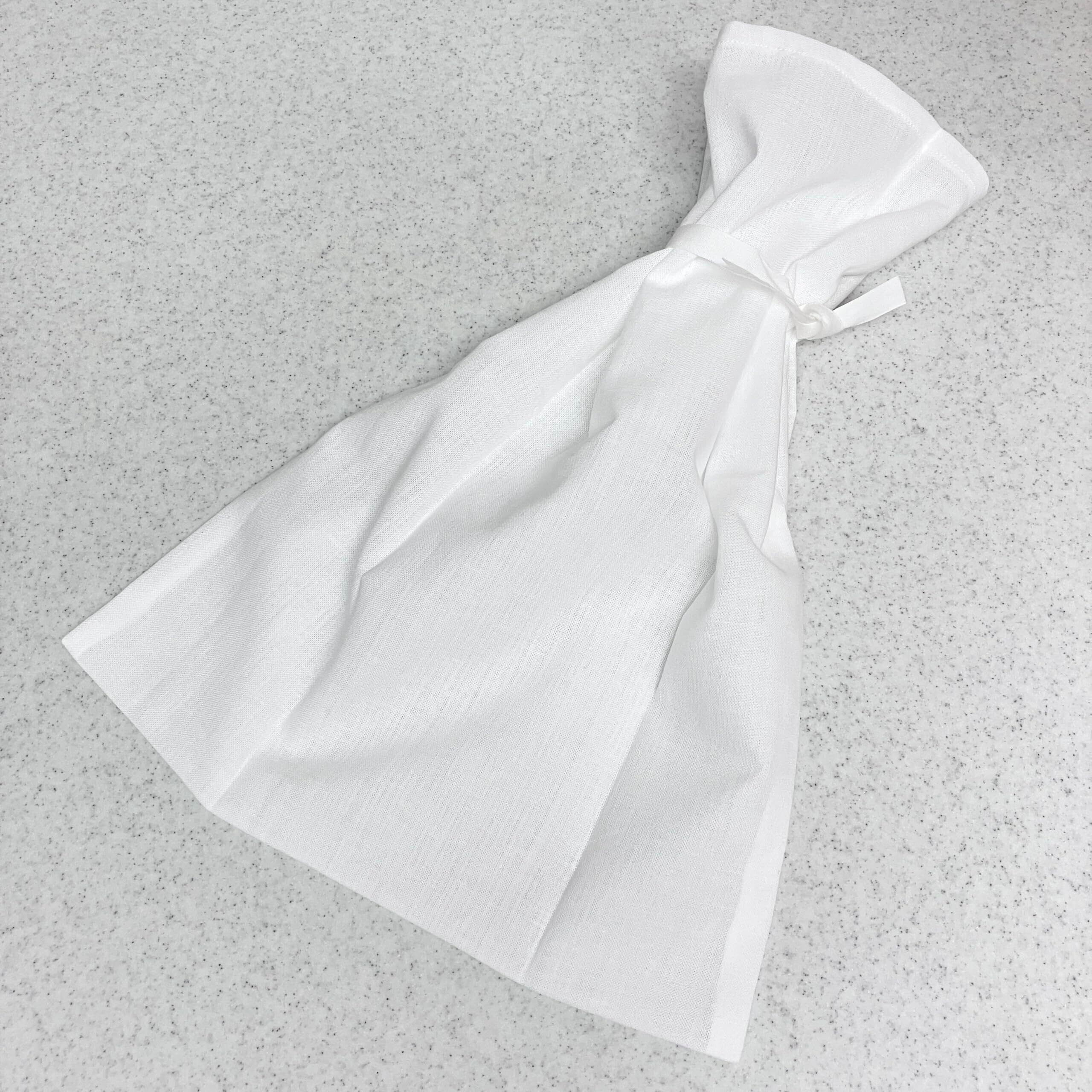 日本製の納骨袋・骨壺袋です。肌さわりの良い無地のさらし(木綿100%)を使用しています。上部に20cmの紐が2本ついていますので結ぶことができます。宗教宗派を問わずご使用いただけます。寸法 43cm × 32cm。さらしは、長時間おくと腐食しますので、ご理解の上ご使用ください。