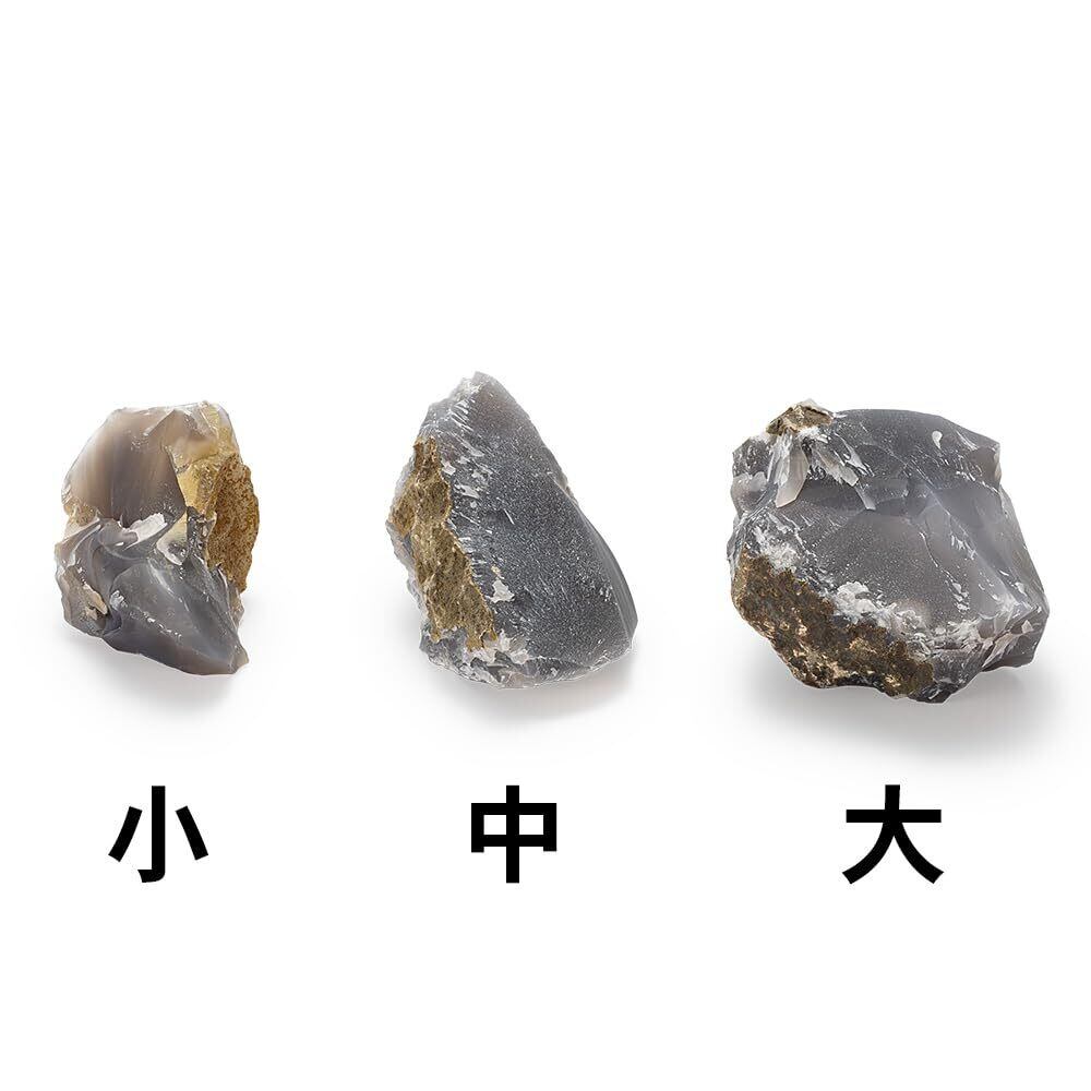 火打石は「メノウ石」を手で割ってつくりますので、寸法も形もひとつひとつ異なります。表示寸法はあくまでも目安となりますのでご注意ください。火打石は火打鎌に打ち付けると火花が出ます。