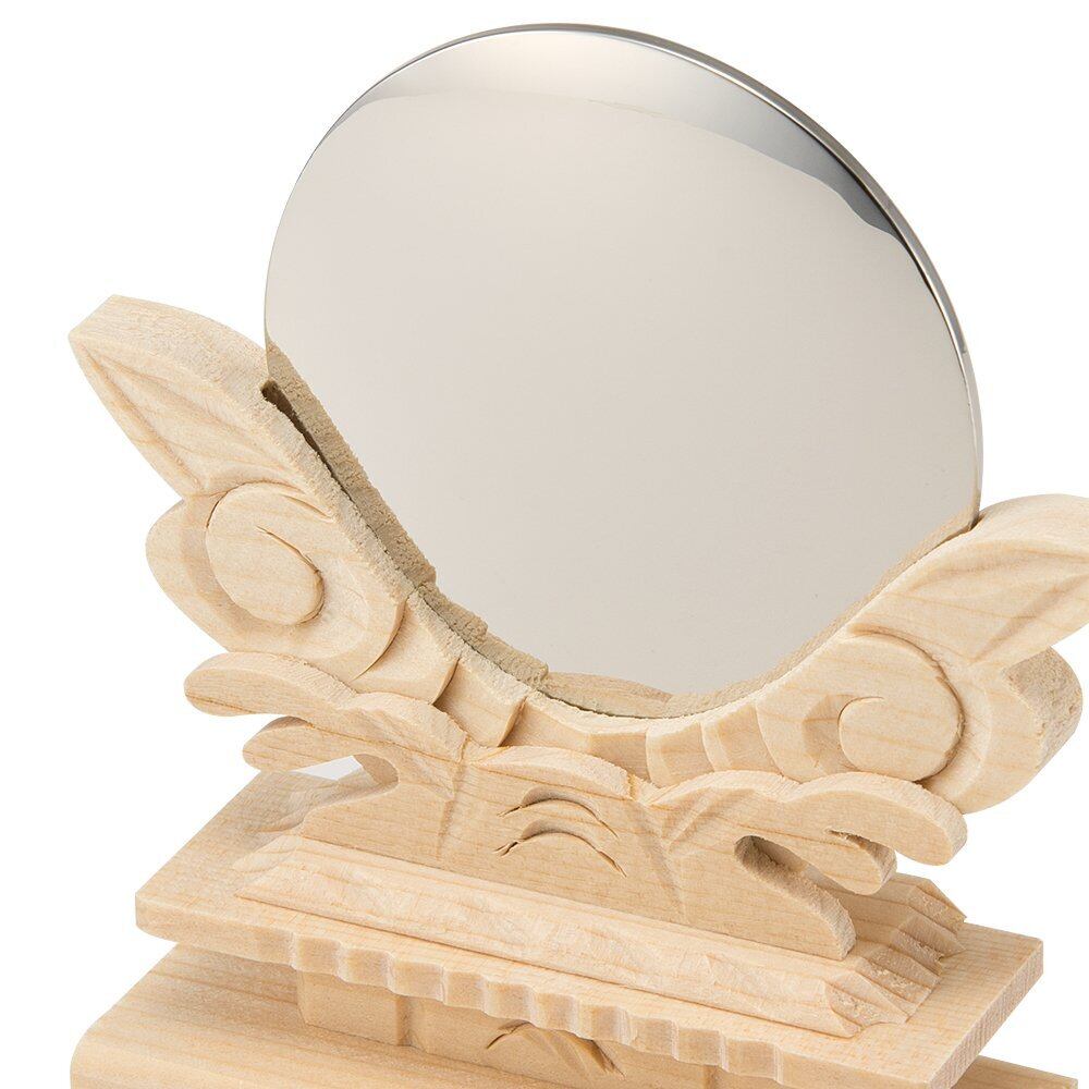 神社に安置される神鏡と同じ、金属製の「本鏡」仕様です。鋳物製でずっしりと重い、すべてを写し込む美しい曲面鏡となっております。