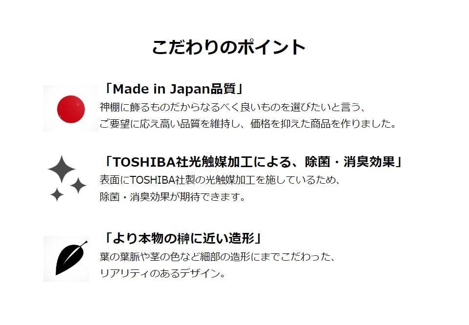 お手入れ不要、造花の榊です。 「もっとリアルなサカキの造花がほしい」 「大切なお供え物だから、安っぽくない方がいい」 などのご要望にお応えし、日本製、Made in Japanクオリティの、 造花榊をお作り致しました! 葉や茎はより本物のさかきに近いデザインで、 美しい葉脈も再現しております。 サカキ全体に光触媒加工済みですので、 除菌や消臭効果も期待できます。 神具や榊立てに真っ直ぐ入りやすいデザインであり、 長さは針金を切ることが出来る枝切りばさみなどで調整可能です。