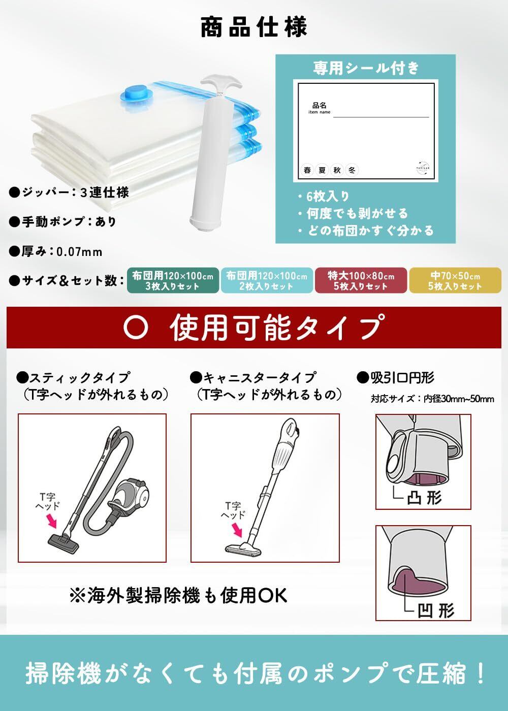 【各サイズ】[布団用 120*100cm ]:羽毛布団や掛け布団から布団一式まで大判のものにオススメ。[特大 100*80cm ]:面積を取るダウンジャケットから枕やバスタオル、ぬいぐるみなどにもオススメ。