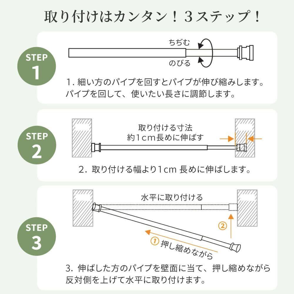 「様々な場所で大活躍」伸縮棒はタイル壁だけでなく、木製壁など様々な表面に使用できます。湿気の多い梅雨の季節でも普段通りに使え、シャワーカーテンロッド、バスルームの衣類用ロッド、室内クローゼットロッド、カーテンロッド、DIY棚、布団干し、屋外物干しなど多岐にわたるシーンで活用できます。