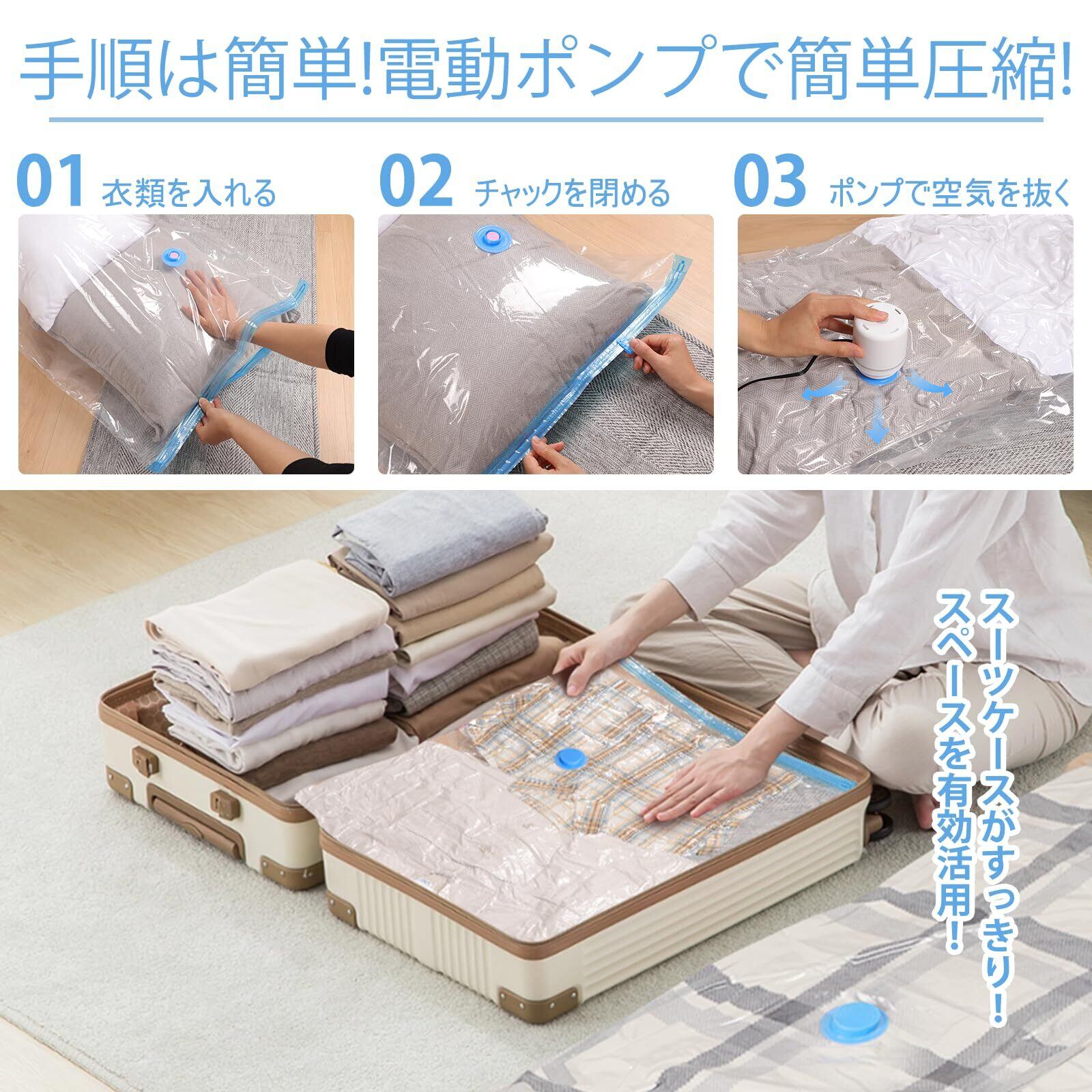 【コードレス電動ポンプ付き】:コードレス充電式電動ポンプがセットに含まれており、どこでも簡単に使用可能。吸引力が強力で、掃除機や手動での煩わしい作業が不要。自宅での収納整理はもちろん、旅行や出張先でも手軽に圧縮でき、時間と手間を大幅に節約します。大人も子供も簡単に操作可能で、初めての方でも安心。