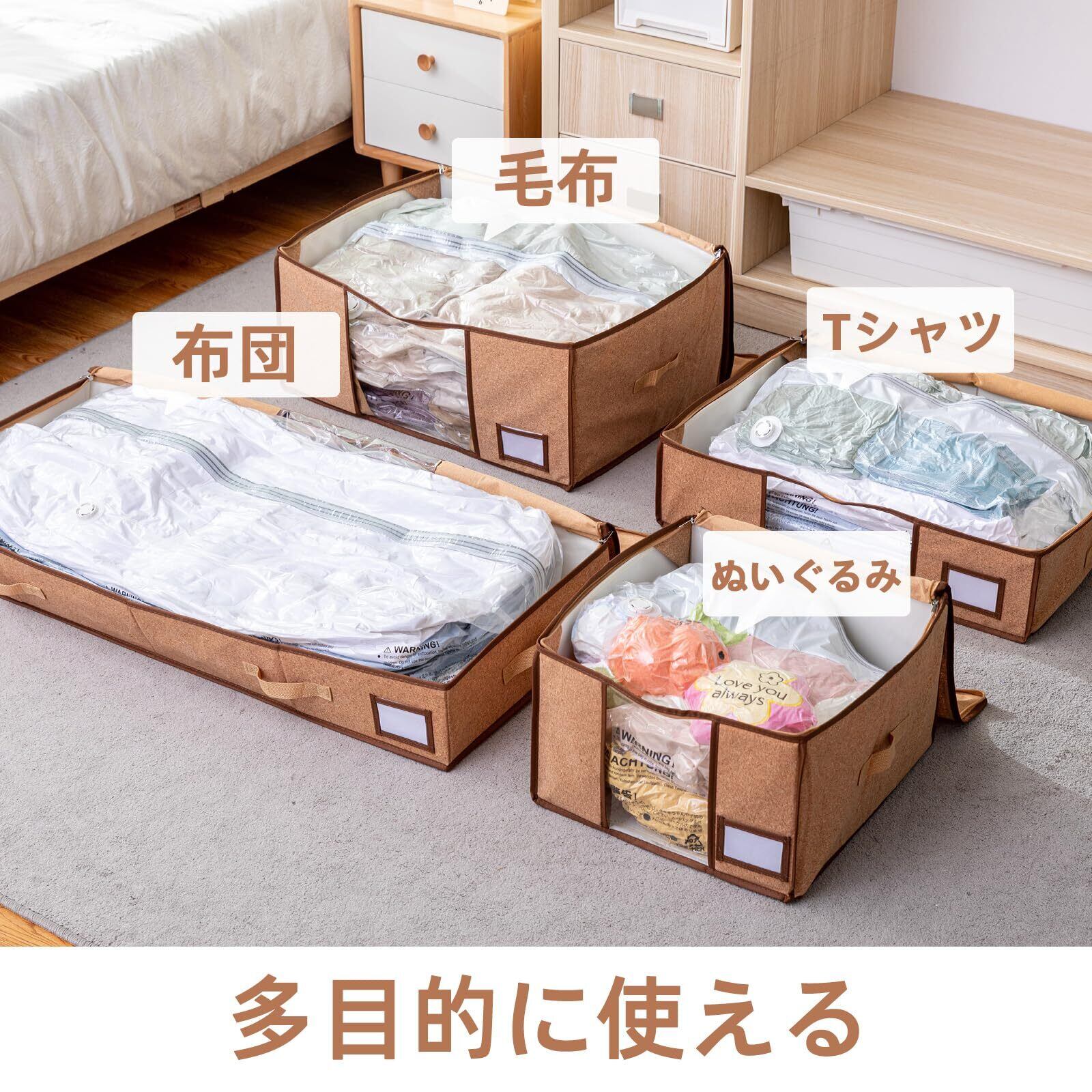 多用途:この布団圧縮ボックスはさまざまなシーンに適しています。折りたたみ式のデザインで、外出や日常の保管に便利です。生活空間が広くなり、押し入れ、クローゼット、衣類、書類、おもちゃやその他の生活用品と事務用品、さらに季節の変わり目収納、引っ越し、雨の日など用途別にたっぷり収納できます