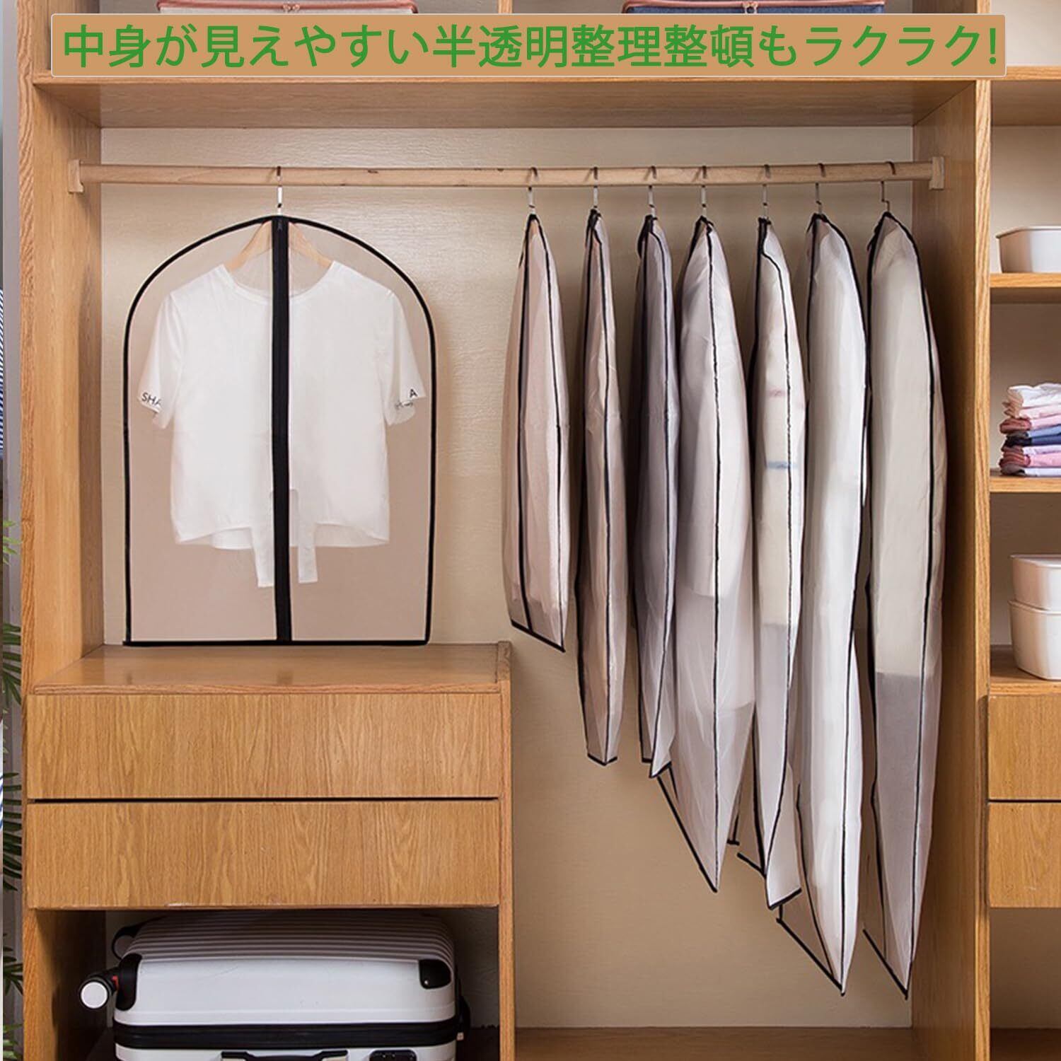 【エコな素材】本体は厚みのあるポリエチレン素材(PEVA)を採用し、通気性も優れて良好な柔軟性や防水性があり、生物が自然分解するできる、防塵防虫防水防菌、耐熱性と絶縁性があります; シワになりにくい、洗って拭いて再利用できる、厚みのあるデザイン、破れにくい、より垂直で省スペース; その防塵効果は、一般的に不織布よりも優れており、耐久性があります。