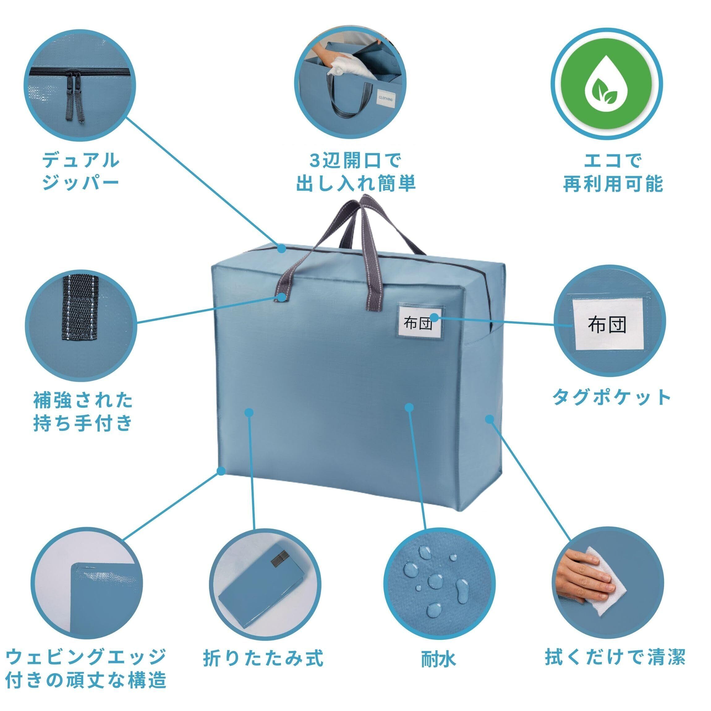 【耐水性】高品質で耐水性に優れたポリプロピレン製の織物素材を使用した布団収納袋です。耐久性があり、湿気やほこり、その他のダメージから大切なアイテムを守ります。汚れた場合は、簡単にウェットティッシュで拭き取ることができます。