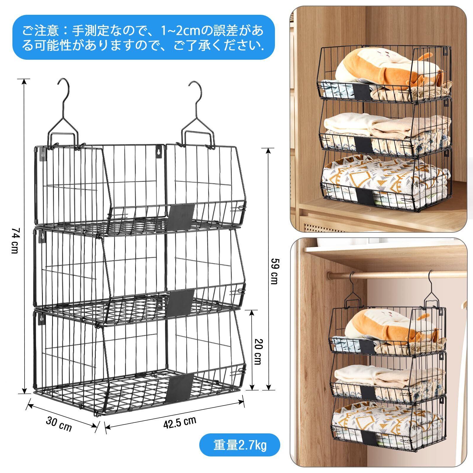 【3way置き方・様々なシーンに適用】吊り下げ式だけでなく、平らな底部設計により、地面に直接置いても安定して使用できます。さらに、ネジを使って取り付けることで、壁面に簡単に掛けることも可能です。クローゼットの衣類収納に適しているだけでなく、本棚、台所の雑物整理、バスルームのタオル収納、リビングルームの雑誌整理など、様々なシーンで活躍します。多機能で汎用性の高い整理ラックで、あなたの生活をサポートします。