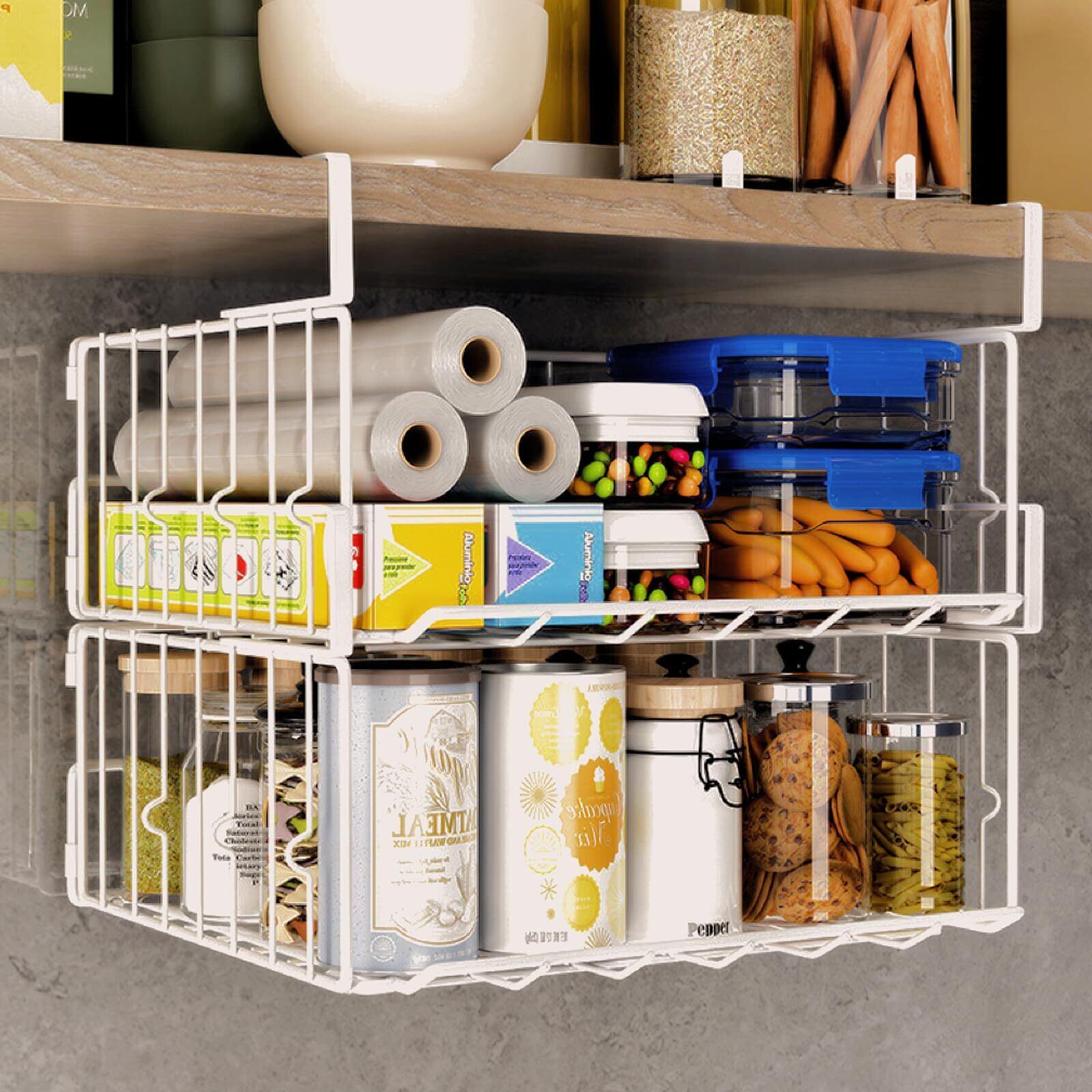 NATTY NING【吊り下げ収納バスケット 折りたたみ可能 積み重ね可能】 穴あけ不要 キッチン収納ラック 省スペース 落下防止設計 戸棚/キッチン収納用(ホワイト 1個セット)