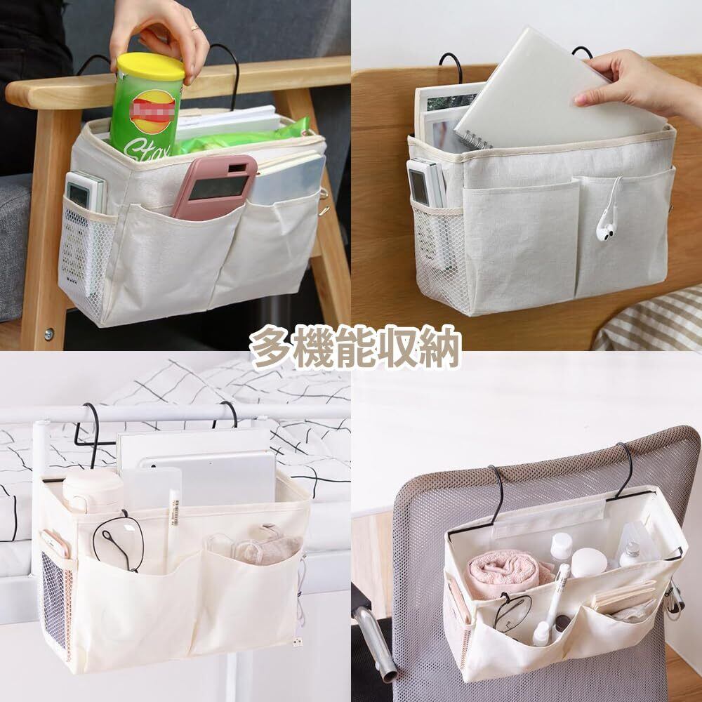 【多機能収納】ベッド用小物入れは、大きなポケットが2つあり、リモコンや小さなノート、日常のアイテムを収納できます。側面の小さなポケットは、携帯電話やイヤホンなどの小物を収納するのに便利です。また、裏面にフックが付いており、本、ペン、眼鏡、携帯電話、iPad、イヤホン、計算機、文房具、ティッシュペーパー、スナック、化粧品、鍵などの小物を簡単に収納できます。
