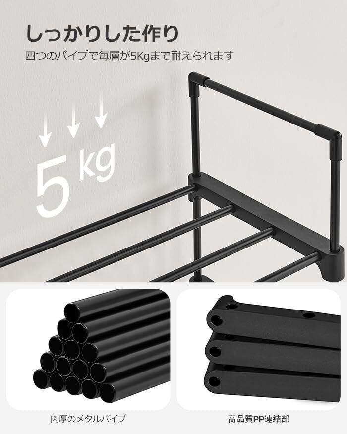 【様々な場所に適用】 シューズラックとしてはもちろん、普通の収納ラックとしても使用できます。リビングルーム、寝室、キッチンなどにも適用します。雑誌、鞄、ぬいぐるみ、衣類、スナック、鉢植えなどの収納も適用!また、軽量で持ち運びやすいです。安全のため、必ず付属の転倒防止用固定紐で製品を壁に固定してください。