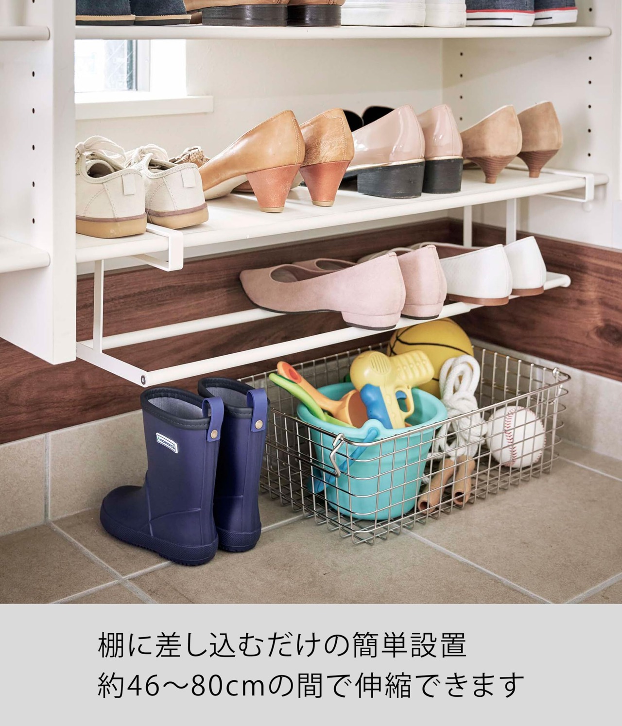 玄関の下駄箱の下に差し込むだけ! 散らかりがちなサンダルやスリッパ・ヒール靴などを浮かせて収納。掃除や来客時に便利なシューズラック。