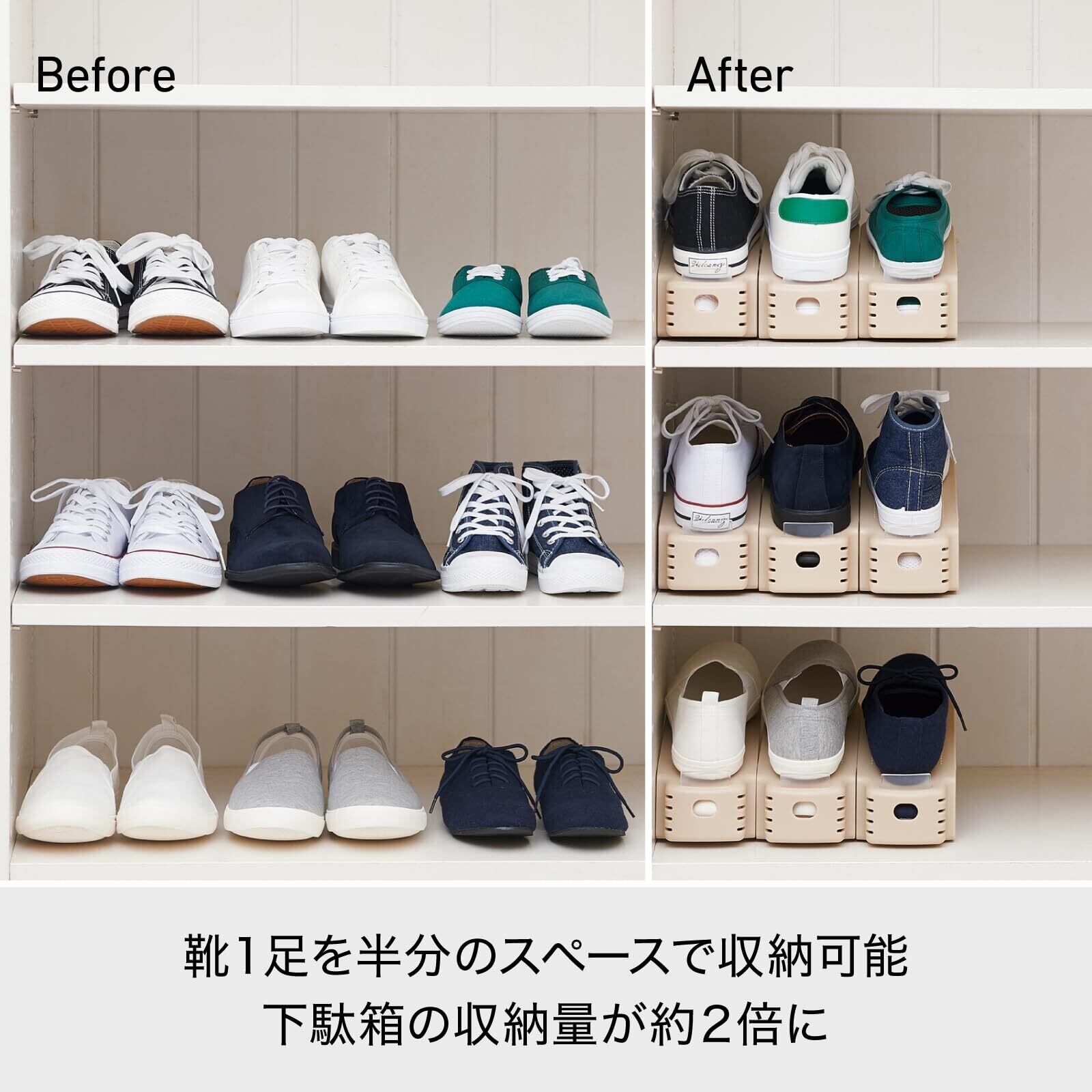 1足分のスペースに2足収納でき、収納量が約2倍にアップ。