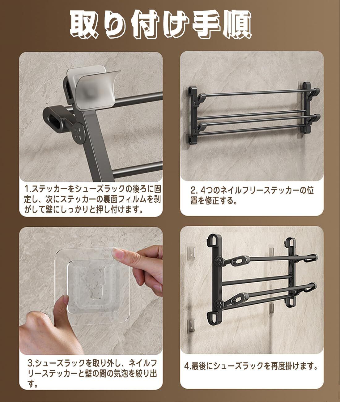 【取り付け簡単&穴開け不要】穴を開ける必要がなく、両面テープ8枚付き取り付けが簡単で、壁を傷つけません。まずネイルフリーシールをシューズラックにバックルで固定し、次にネイルフリーシールの裏面フィルムを剥がして壁にしっかりと押し付けます。 4つのネイルフリーステッカーの位置を修正したら、シューズラックを取り外し、ネイルフリーステッカーと壁の間の気泡を絞り出し、最後にシューズラックを再度掛けます。シューズラックはガラス、大理石、金属、木材、その他の壁に取り付けることができます。