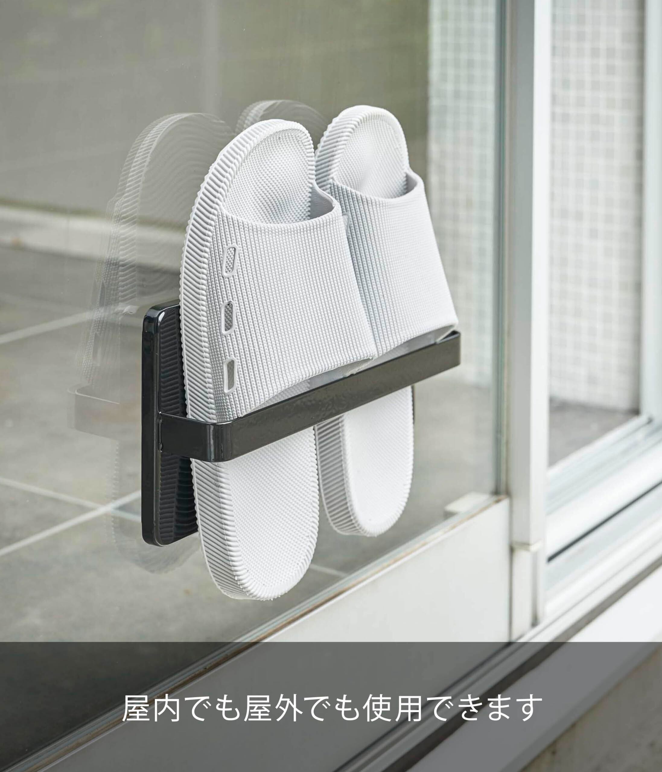 雨や風を避けてベランダスリッパを室内の窓や扉に吸盤で付けて簡単収納! 付属の木ネジで壁にも取り付けられます。
